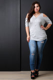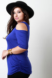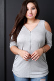 This plus size top features a jersey knit fabrication, zipper-detailed v-neckline, cold shoulder construction, and elbow sleeves. Finished with a side ruching detail. Accessoreis sold separately. Made in U.S.A. 96% Rayon, 4% Spandex.
