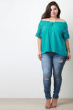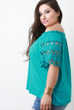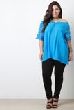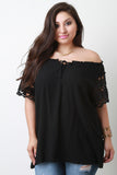 This plus size top features a woven fabrication, elastic off the shoulder neckline, ruffle trim , small tie keyhole, embroidered lace sleeves, and a loose boxy fit. Accessories sold separately. 65% Cotton, 35% Polyester.