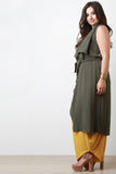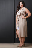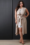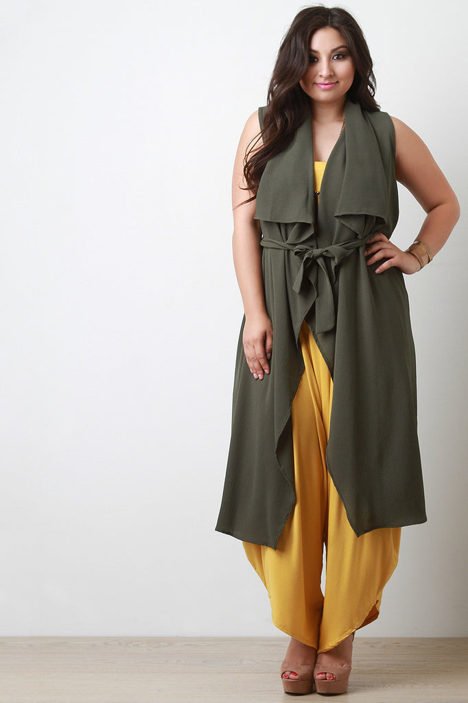 This plus size sleeveless vest has a textured fabrication design, featuring a waterfall open front silhouette with a self tie belt along the waist. Accessories sold separately. 97% Polyester. 3% Spandex.
