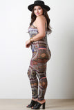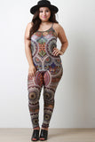 This plus size jumpsuit is sheer mesh and fitted design. Scooped neckline and sleeveless silhouette. Tribal print throughout. Unlined. Accessories sold separately. 95% Polyester. 5% Spandex.