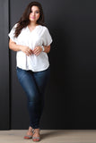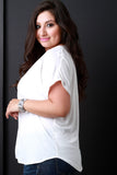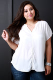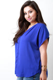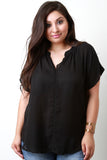 This casual plus size top features a front chiffon fabric with back jerset knit, half placket neckline with center seam detail, short dolman sleeves, and rounded hemline. Accessories sold separately. Made in U.S.A. Self: 100% Polyester. Contrast: 95% Rayon, 5% Spandex.