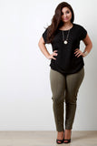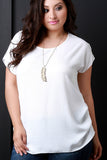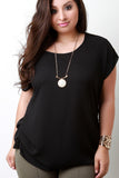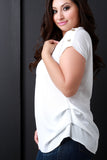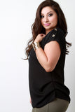 This plus size top features a lightweight woven fabric, scoop neckline, button-detailed shoulders, and short dolman sleeves. Finished with a rounded hemline with gathered sides design. Accessories sold separately. Made in U.S.A. 100% Polyester.