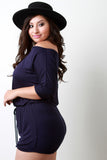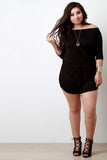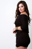 This plus size top features a jersey knit fabrication, elasticized off the shoulder neckline, dolman elbow sleeves, and elasticized waist with self-tie woven lace. Accessories sold separately. Made in U.S.A. 95% Rayon, 5% Spandex.