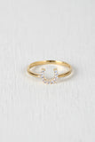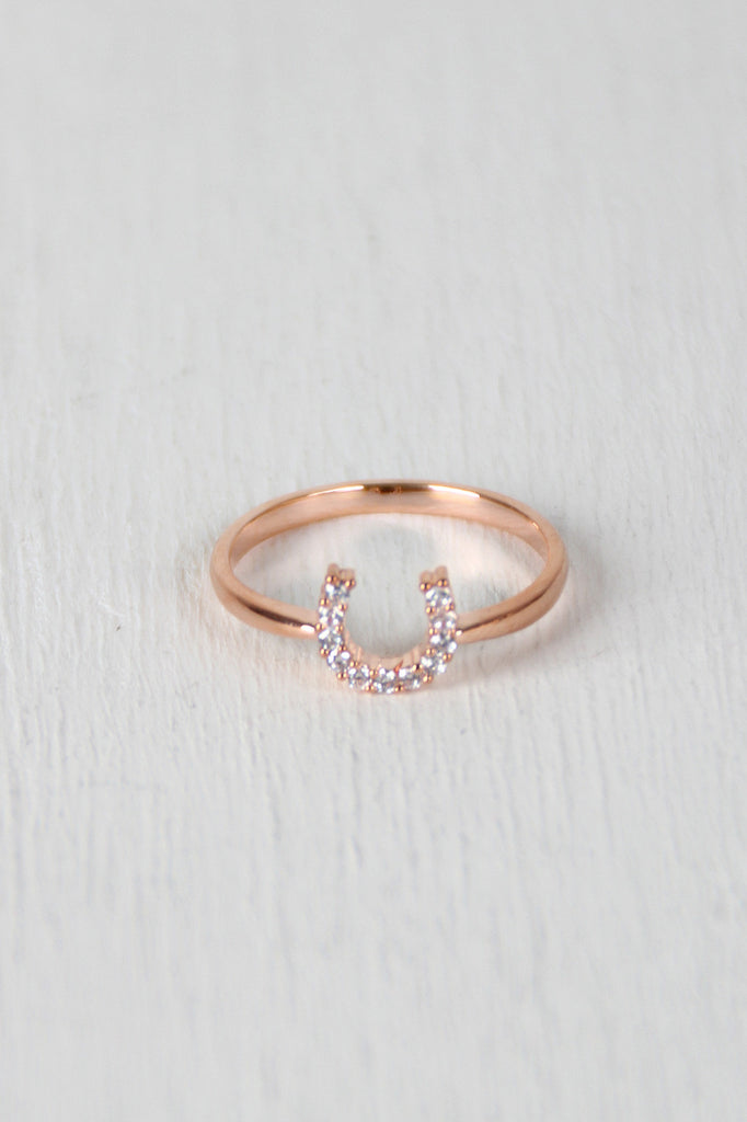 This delicate ring features a high polished metal finish and a horseshoe detail embedded with rhinestones on a non-adjustable band.