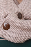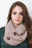 This scarf features a chunky knitted fabrication, wood button detail, and a closed end circle scarf design.