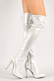 These eye-catching  thigh high boots  feature a shimmery metallic vegan leather throughout, almond toe silhouette, and wrapped stiletto heel. Finished with lightly cushioned insole, and partial side zipper closure for easy on/off.