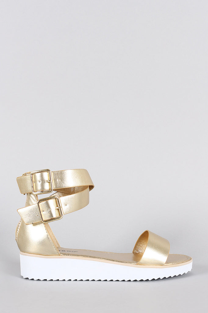 This open toe lug sole . Features two adjustable crossing ankle straps. Finished with an adjustable rear back zipper.