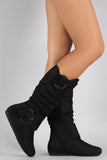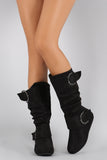 These round toe knee high length, depending on personal height. Designed with a slouchy shaft and two decor buckles. Features an inner side zipper for easy on off wear. Finished small elastic gore for a custom fit and soft interior lining.