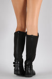 These stylish knee high boots feature a combination of vegan leather/stretchy Lycra upper, round toe silhouette, decorative strap with snap button detail, and low block heel. Finished with cushioned insole, soft faux fur interior lining, and full side zipper closure for easy on/off.