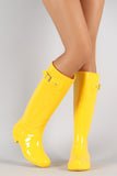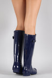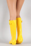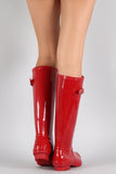 These knee high rain boots feature a rounded toe, buckle decor on shaft, and low heel. Finished with cushioned insole and easy pull on style.