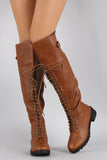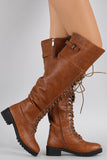 These bold over-the-knee boots feature a round toe silhouette, lace up front, lug sole, and block heel. Also features a partial elastic gusset insert and decorative buckle strap detail. Finished with soft faux fur interior lining, cushioned insole, and full-length side zipper closure for easy on/off.