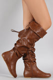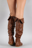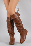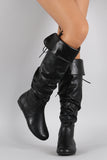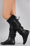 These knee high length, depending on personal height, with an optional fold-over cuff. It is slouchy shaft silhouette with light faux fur lining and an inner mid-way side zipper. Finished with a cute little lace up detail on the back.