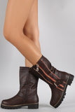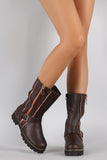 These edgy boots feature a zipper trims on shaft, instep buckle strap detail, rounded toe, lug sole, and block heel. Finished with cushioned insole, soft interior lining, and full-length side zipper closure for easy on/off.