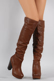 These over-the-knee boots feature a slouchy shaft design, slit details, tribute platform, and chunky stacked heel. Finished with cushioned insole, soft interior lining, and partial side zipper closure for easy on/off.
