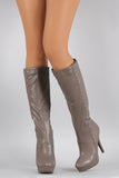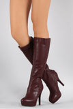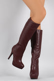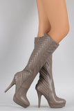 These attractive knee high boots feature an almond toe silhouette, center seam detail, quilted design at the back shaft, tribute platform, and wrapped heel. Finished with cushioned insole, soft faux fur interior lining, and rear zipper closure for easy on/off.