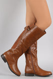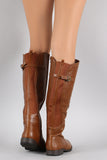 These fashion-forward knee high boots feature a round toe silhouette, vegan leather shaft with partial elastic gore insert, buckle strap detail, top stitching accents, and low heel. Finished with cushioned insole, soft interior lining, and full-length side zipper closure for easy on/off.