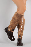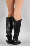 These eye-catching rain boots feature a combination of PVC/crinkle textured fabric upper, decorative buckle strap details, slanted raw collar, and low heel. Finished with cushioned insole, soft faux fur interior lining, and full-length side zipper closure for easy on/off.