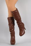 These stunning knee high boots feature an almond toe silhouette, slouchy shaft design, tribute platform, and wrapped heel. Finished with cushioned insole, soft faux fur interior lining, and partial side zipper closure for easy on/off.