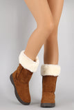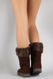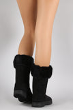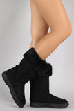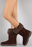 These cozy boots feature a round toe silhouette, vegan suede upper with soft faux fur cuff design, cushioned insole, and faux fur interior lining for all day comfort.