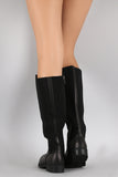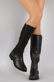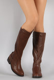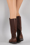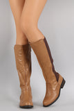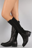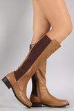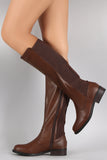 These edgy knee high boots feature a round toe silhouette, vegan suede with elasticized panels insert, stitching accents, and low stacked heel. Finished with cushioned insole, partial faux fur interior lining, and full-length side zipper closure for easy on/off.