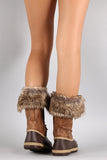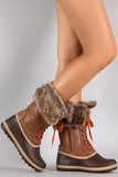 These faux fur cuff and interior lining, faux suede shaft, and water resistant PVC upper with ridges and faux stitching detail. To add to the rugged look, these boots feature two-tone round laces, bronze-tone hexagon grommets, and tread sole. Finished with a round toe, flat heel, and side zipper for easy on/off.