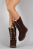 These cozy flat boots feature a round toe with moc stitching accents, soft faux fur interior lining, cushioned insole, and lace up closure.