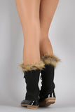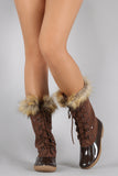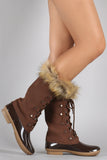 These duck mid calf boots feature a combination of vegan leather/PVC upper with cozy faux fur cuff design, decorative D-ring with lace up closure, and low heel. Finished with cushioned insole and soft interior lining.