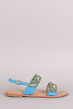 This gorgeous flat sandal features an open toe silhouette, double band with multicolor beads embellishment, and adjustable slingback strap with buckle closure.
