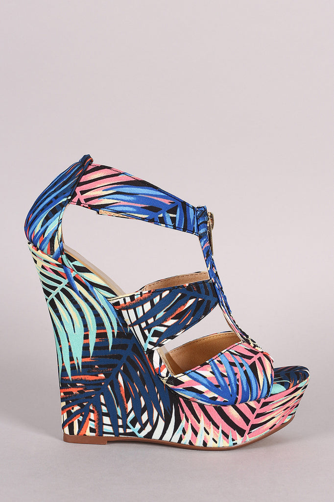 This wedge features a palm leaves print fabric throughout, peep toe silhouette, and exposed metallic zip-closure at front. Finished with wrapped platform wedge heel and lightly padded insole for comfort.
