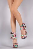 This charming platform floral print satin upper with nubuck trims, wedge heel, and wrapped platform. Finished with lightly padded insole and self-tie wrapped around laces.