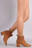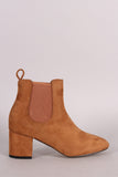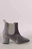 These ankle boots features a soft velvet or vegan suede upper with partial elastic gore insert, square toe silhouette, pull on tab, and covered block heel. Finished with cushioned insole and easy pull-on construction.