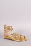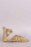 This flat sandal features a crinkled vegan leather upper, soft toe ring, strappy caged design vamp, lightly padded insole, and convenient back-zip closure.