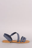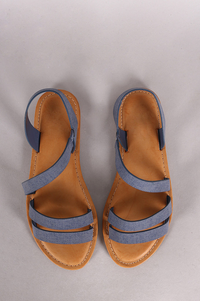 This summery flat sandal features a denim print nubuck upper, open toe silhouette with asymmetrical strappy construction, and lightly padded insole for comfort.