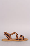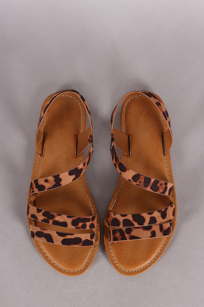 This summery leopard print vegan suede upper, open toe silhouette with asymmetrical strappy construction, and lightly padded insole for comfort.