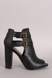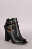 These stylish booties feature a peep toe silhouette, side cutout designs, double straps with two buckle accents, and chunky wrapped heel. Finished with cushioned insole and convenient back-zip closure.