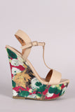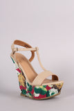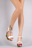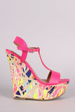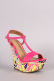 This vibrant platform wedge features a vegan leather upper, watercolor print wrapped platform wedge heel, t-strap construction, and slingback. Finished with a lightly padded insole, and an adjustable ankle strap.