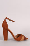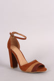 This sophisticated peep toe heel features a pleated vegan suede upper constructed with topstitching accent, chunky wrapped heel, lightly padded insole, and adjustable ankle strap with side buckle fastening.