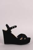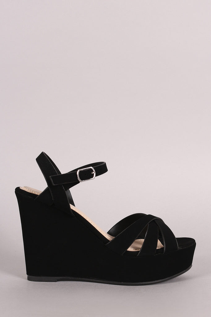 This lovely wedge sandal features a crisscrossing straps design, open toe silhouette, and wrapped platform wedge heel. Finished with lightly padded insole and adjustable ankle strap with side buckle fastening.