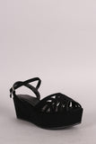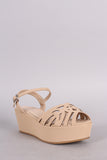 This trendy flatform features a peep toe silhouette with geometric cutouts, wrapped platform wedge heel, and adjustable ankle strap with buckle fastening. Finished with lightly padded insole for comfort.