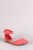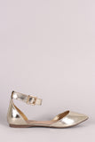 These flats feature a dorsay inspired silhouette, lightly padded insole, and adjustable ankle strap with buckle fastening.