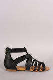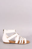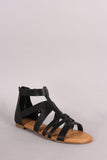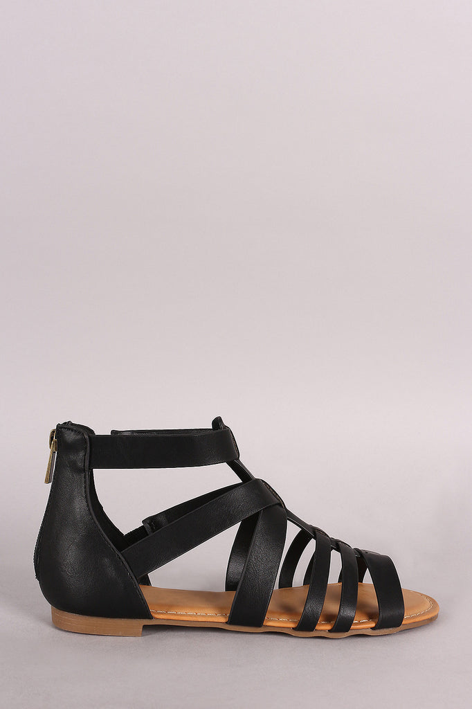 This flat sandal features an open toe silhouette, strappy construction with partial elastic gusset insert, and slight heel. Finished with lightly padded insole and convenient back zip closure.