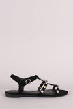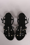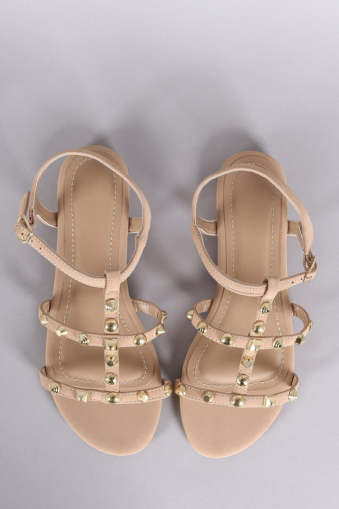 This flat sandal features a nubuck upper, three straps across vamp, t-strap construction with studs design, and slingback with side buckle closure. Finished with a lightly padded insole.