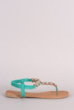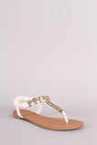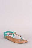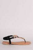 This chic flat sandal features a T-strap construction with metallic ornament embellishment, slingback strap with an elasticized back, and easy pull-on construction.