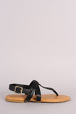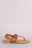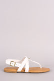 This open toe flat sandal features a T-strap construction with medallion accents, lightly padded insole, and adjustable slingback strap with buckle fastening.
