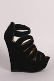 This peep toe wedge features a crisscrossing wavy straps design, stitching accents, and wrapped platform wedge heel. Finished with lightly padded insole and back-zip closure.