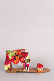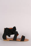 This flat sandal features one upper band across vamp, cross warp around ankle strap, elastic for slight stretch, fabric bow detail, and a back zipper for easy on/off. Finished with a lightly padded insole.