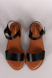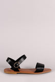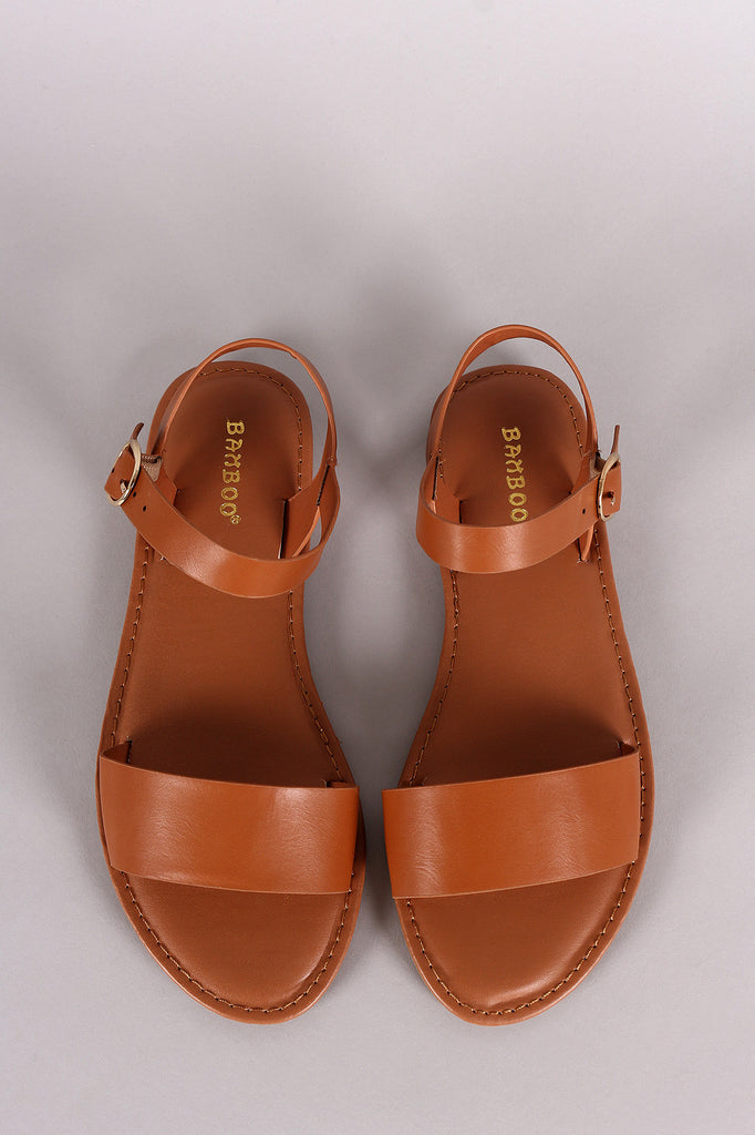 This flat sandal features one band across vamp in vegan leather, and an ankle strap with an adjustable side buckle closure. Finished with a lightly padded insole.