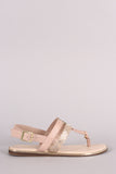 This edgy flat sandal features a T-strap construction with metallic square ornament embellishment, snake print hologram vegan leather strap, and metal zigzag trims along the edge. Finished with a lightly padded insole, slight heel, and adjustable slingback strap with buckle fastening.