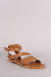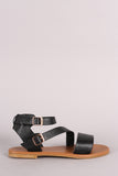 This flat sandal features an open toe silhouette, asymmetrical straps design, lightly padded insole, and adjustable ankle strap with buckle fastening.