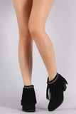These stylish booties feature a perforated vegan suede upper with decorative chained fringe detail, round toe silhouette, and chunky heel. Finished with cushioned insole and side zipper closure for easy on/off.
